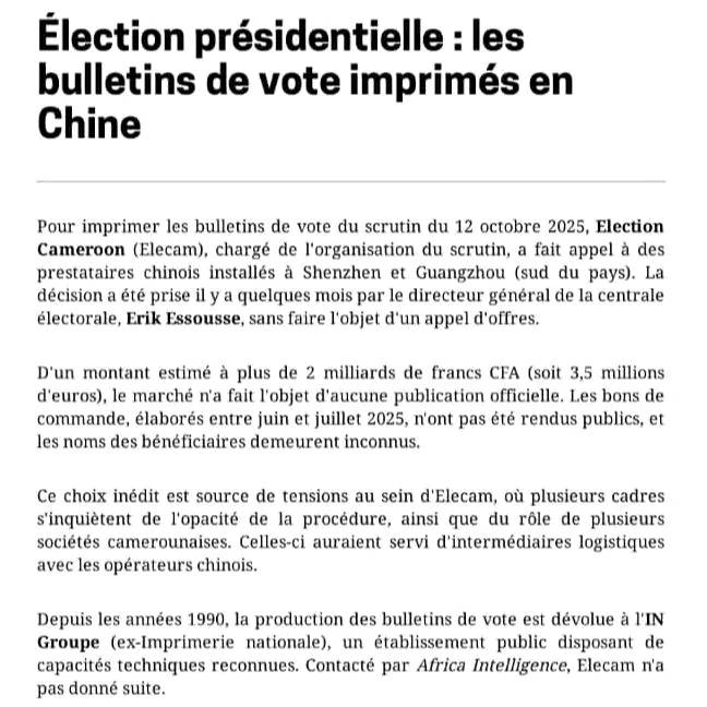 Selon notre confrère Africa Intelligence, cette décision n’est pas du goût de plusieurs cadres d’Elections Cameroon ( Elecam) qui pensent que ce choix serait de nature à entacher la crédibilité du scrutin.
