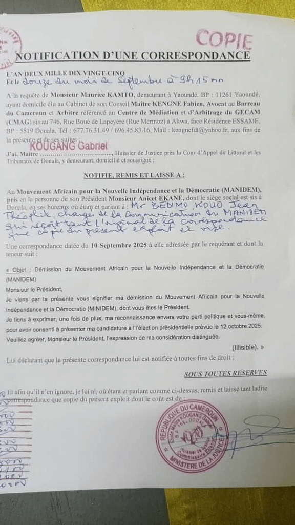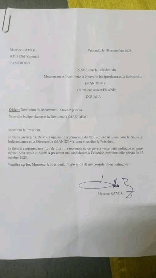 Après le rejet de sa candidature par le conseil constitutionnel sous la bannière de ce parti politique, l’ancien candidat a adressé ce vendredi 12 septembre 2025, une lettre à Anicet Ekané pour les besoins de la cause.