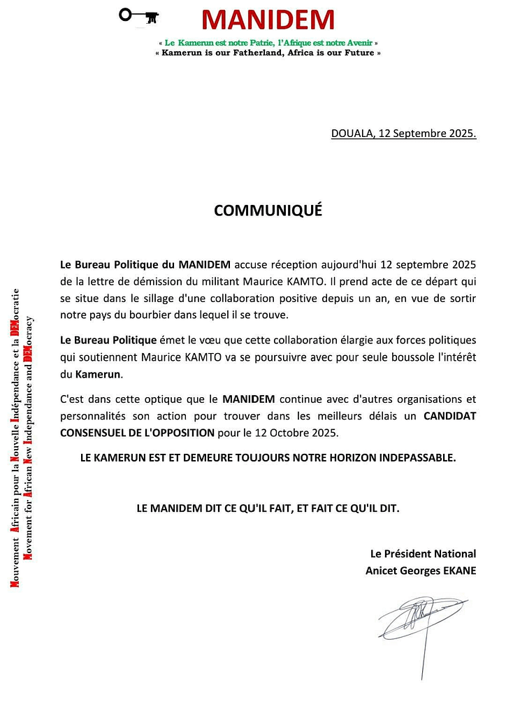 Dans une déclaration publiée sur les réseaux sociaux ce vendredi, Maurice Kamto affirme avoir quitté les rangs du Manidem : « Pour les raisons que j’ai eues à rappeler en d’autres circonstances , j’ai dû présenter ma candidature à l’élection présidentielle de 2025 sous la bannière du MANIDEM. Cette candidature a subi la barbarie administrative et l’arbitraire juridictionnel sans précédents que l’on sait. Le mandat que le Conseil National du MRC m’avait donné lors de sa réunion du 26 octobre 2024, de choisir la modalité de présentation de ma candidature dans le cadre de cette élection présidentielle prévue le 12 octobre prochain, a expiré avec la décision honteuse du Conseil constitutionnel du 5 août 2025 et, avec lui, la raison pour laquelle j’avais démissionné de la présidence nationale du MRC. Par parallélisme des formes, le Conseil National du MRC a constaté cette fin de ma mission lors de sa réunion du 6 septembre 2025, par une résolution dans laquelle il demande mon retour dans le parti et la reprise de mon mandat de Président National du MRC. Afin de donner suite à cette demande, je devais démissionner d’abord du MANIDEM. C’est ce que j’ai fait ce jour, 12 septembre par une lettre de démission notifiée au MANIDEM, avec effet immédiat. Je tiens à saluer chaleureusement, une fois de plus, le sens patriotique du Président du MANIDEM, Georges Anicet EKANE, et les bonnes dispositions des cadres et des militants du MANIDEM à mon égard.«