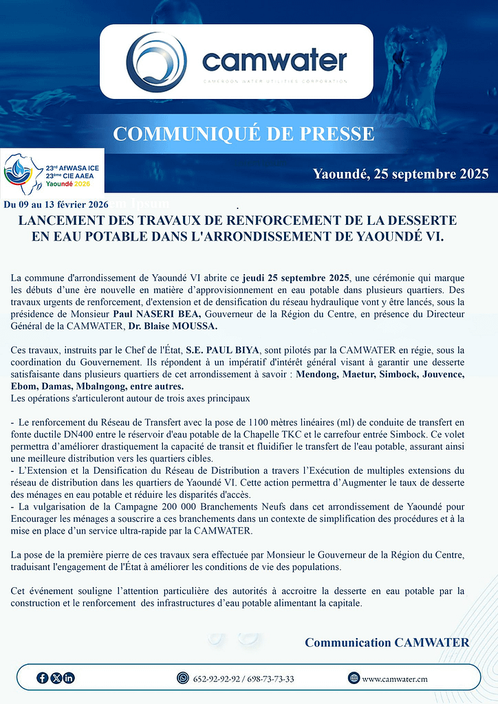 Des travaux urgents de renforcement, d’extension et de densification du réseau hydraulique seront lancés, sous la présidence de Naseri Paul Bea, gouverneur de la région du Centre, en présence du Dr Blaise Moussa DG de la Camwater. Ils répondent à un impératif d’intérêt général visant à garantir une desserte suffisante dans plusieurs quartiers de cet arrondissement.