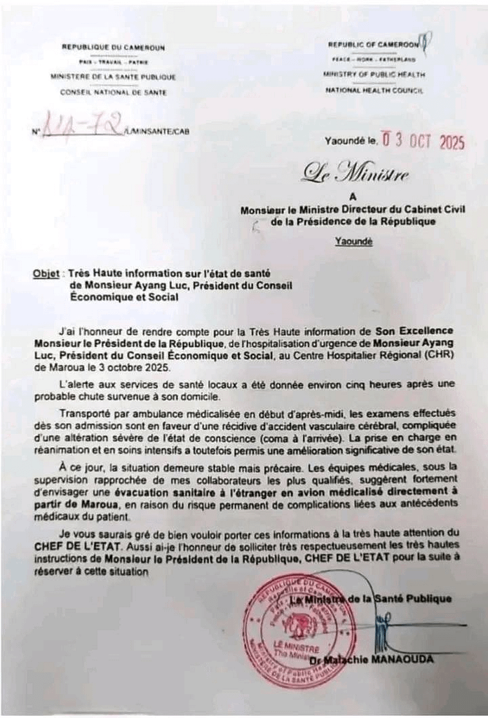 Victime d’un accident vasculaire cérébral (AVC) à son domicile de la capitale régionale de l’Extrême Nord, la situation sanitaire de Ayang Luc âgé de 78 ans est stable.