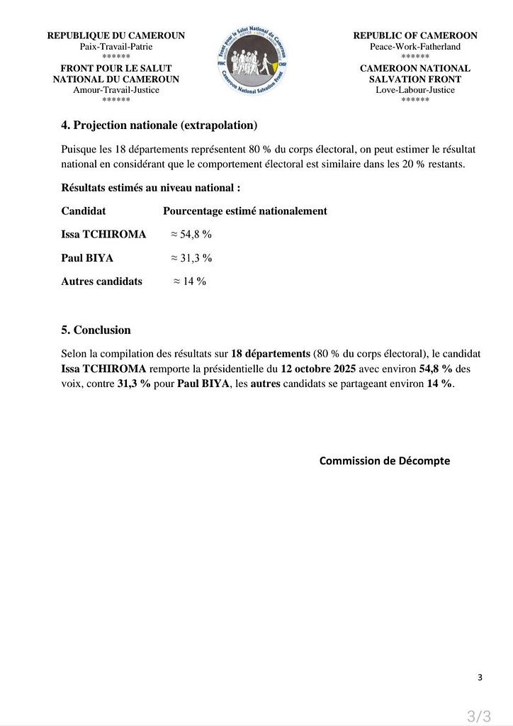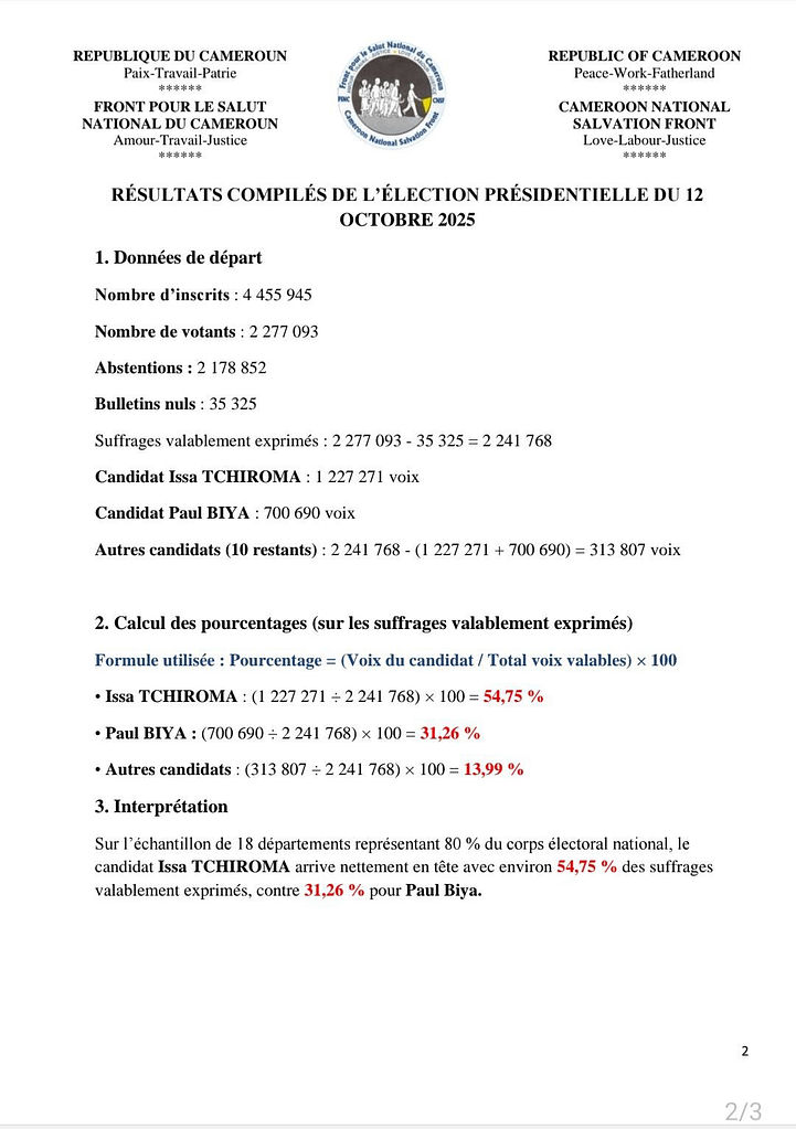 Sur l’échantillon de 18 départements représentant 80 % du corps électoral national, le candidat Issa TCHIROMA arrive nettement en tête avec environ 54,75 % des suffrages valablement exprimés, contre 31,26 % pour Paul Biya.
