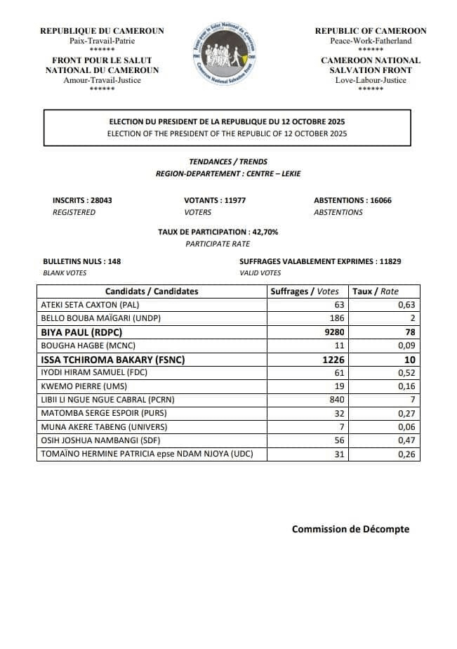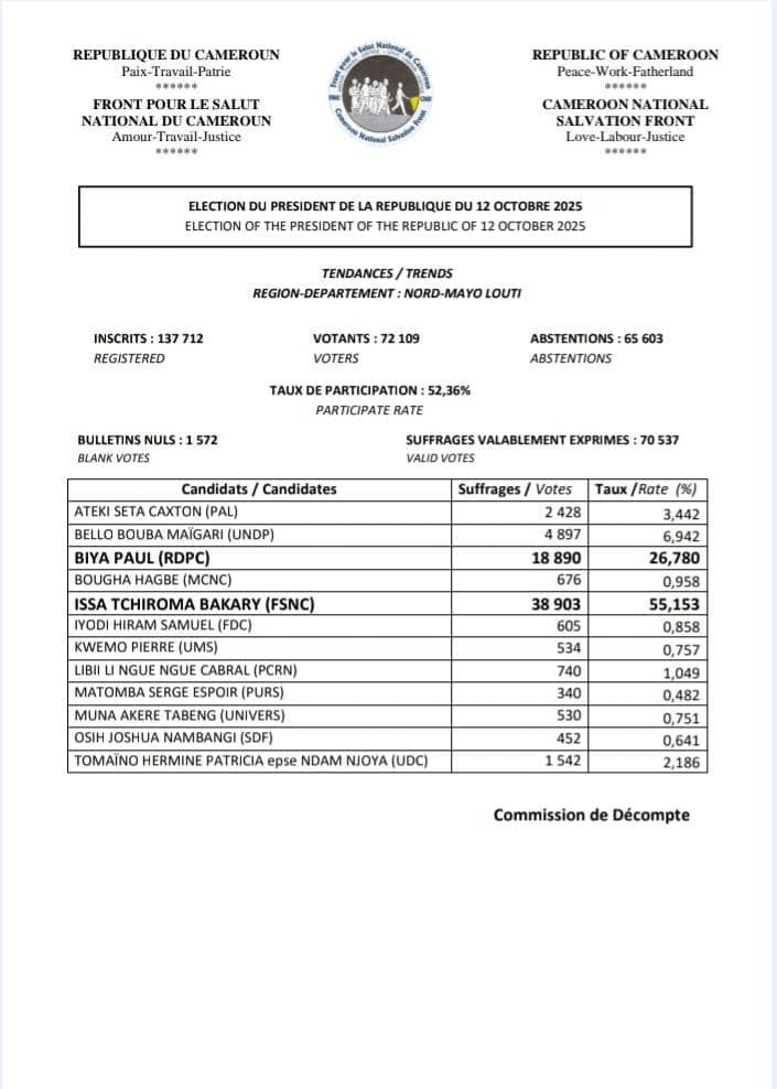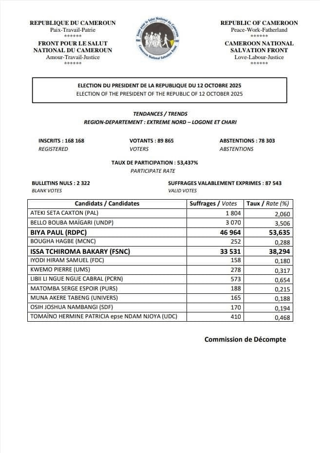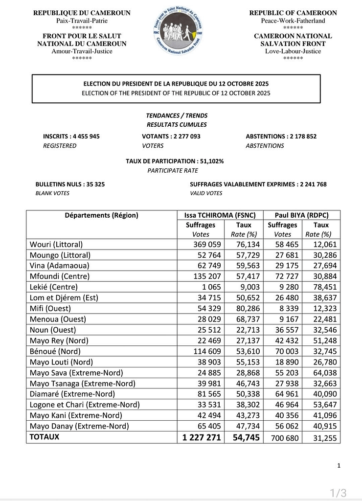 Selon la compilation des résultats sur 18 départements (80 % du corps électoral), le candidat Issa TCHIROMA remporte la présidentielle du 12 octobre 2025 avec environ 54,8 % des voix, contre 31,3 % pour Paul BIYA, les autres candidats se partageant environ 14 %.