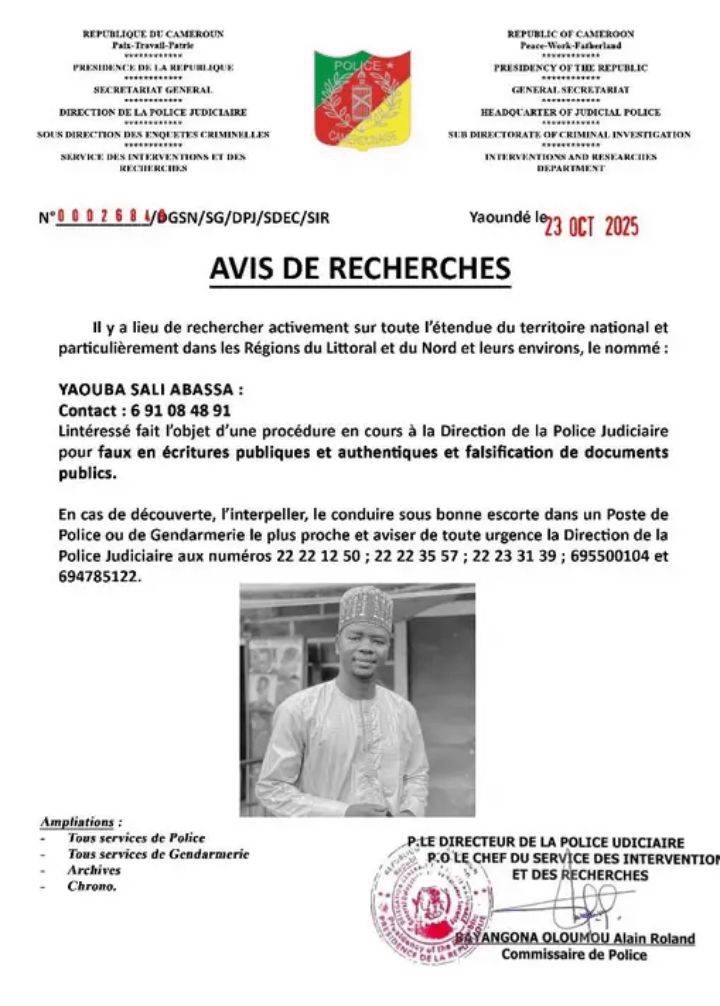 Yaouba Sali Abassa est ciblé par un avis de recherche signé le jeudi 23 Octobre 2025, par le Chef du service des interventions et des recherches de la Direction de la Police Judiciaire, a appris Le courrier du cameroun.