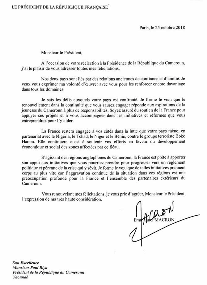 Le 25 octobre 2018, le Chef de l’exécutif français avait pourtant adressé un message de félicitations à son homologue Camerounais.