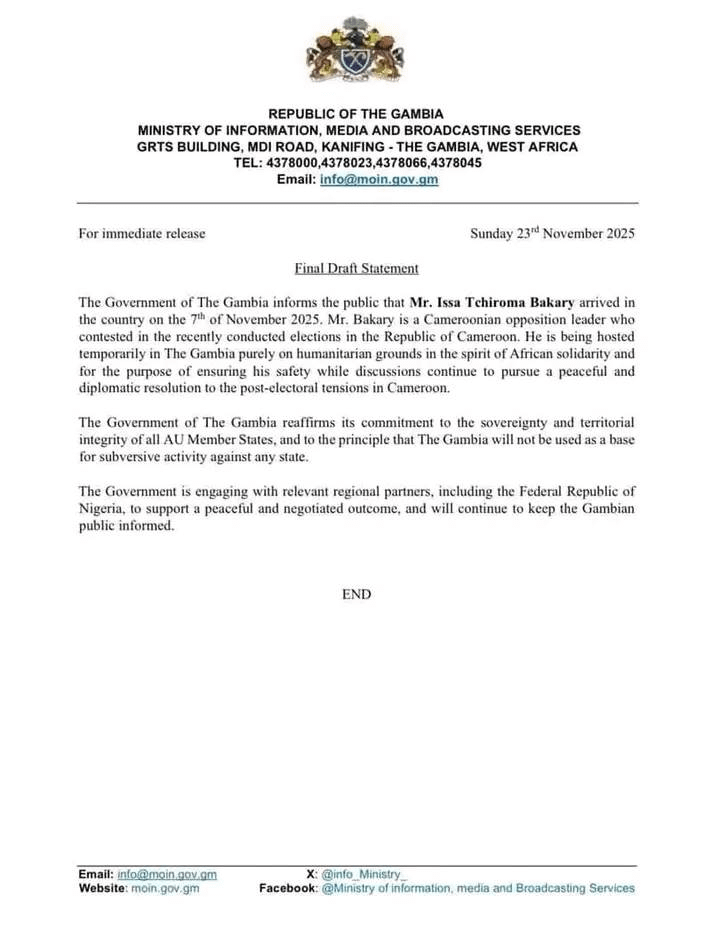 Le gouvernement de Gambie a informé dimanche le public de l’arrivée dans le pays de M. Issa Tchiroma Bakary le 7 novembre 2025, précisant que ce leader de l’opposition camerounaise est hébergé temporairement « pour des raisons purement humanitaires dans un esprit de solidarité africaine ».