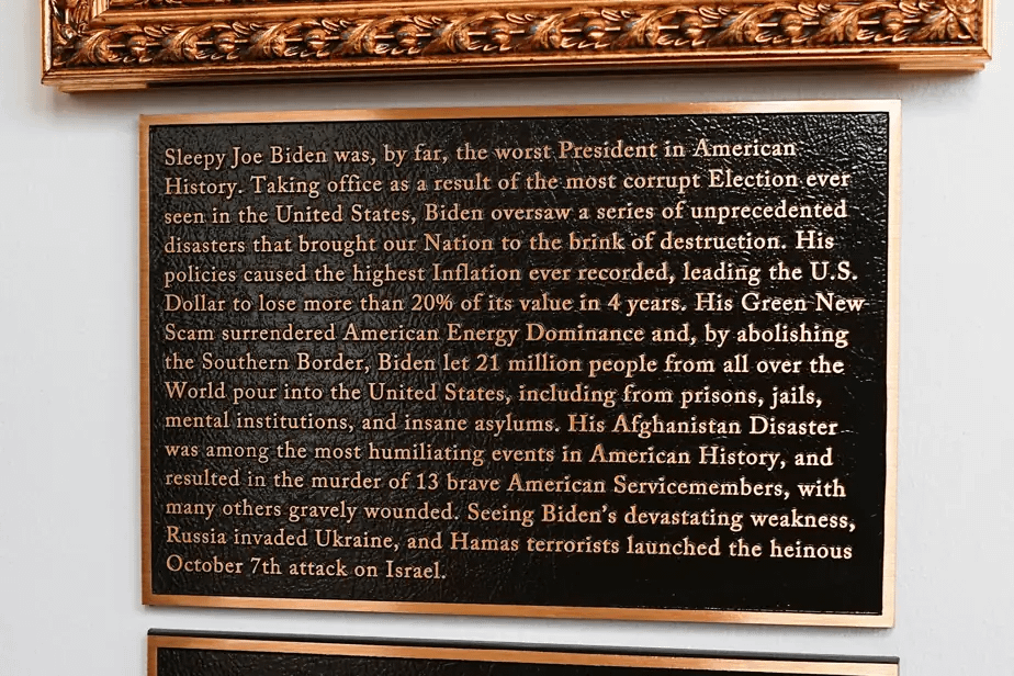 La plaque reprend aussi l’affirmation mensongère selon laquelle l’élection de 2020 aurait été volée à Donald Trump.