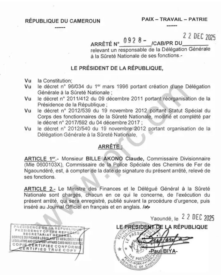 Paul Biya vient de relever de ses fonctions dans un arrêté signé ce lundi 22 décembre 2025 le commissaire divisionnaire BILLE AKONO Claude , commissaire du commissariat spécial des chemins de fer de Ngaounderé