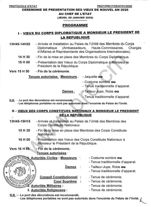 Cameroun: Voici le programme de la cérémonie des voeux du corps diplomatique et des corps constitués à Paul BiyaAccueilPMJan7 par Le courrier du cameroun lecourrierducameroun@gmail.com 7 janvier 2026 0 1 minute 15 heures Le palais de l’unité recevra ce jeudi 08 Janvier 2026, cet événement qui marque habituellement l’ouverture de la nouvelle année. À la une politique Navigation de l’article Article précédentArticle suivant Laisser un commentaire Annuler la réponseVotre adresse e-mail ne sera pas publiée. Les champs obligatoires sont indiqués avec *Commentaire * Nom * E-mail * Site web Enregistrer mon nom, mon e-mail et mon site dans le navigateur pour mon prochain commentaire.