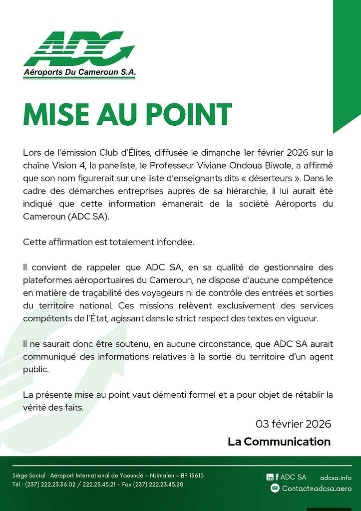 Dans une mise au point des Aéroports du Cameroun (ADC) signée hier , l’enseignante d’université est accusée d’avoir tenu des propos erronés au cours de l’émission Club d’Elites diffusée sur Vision 4.