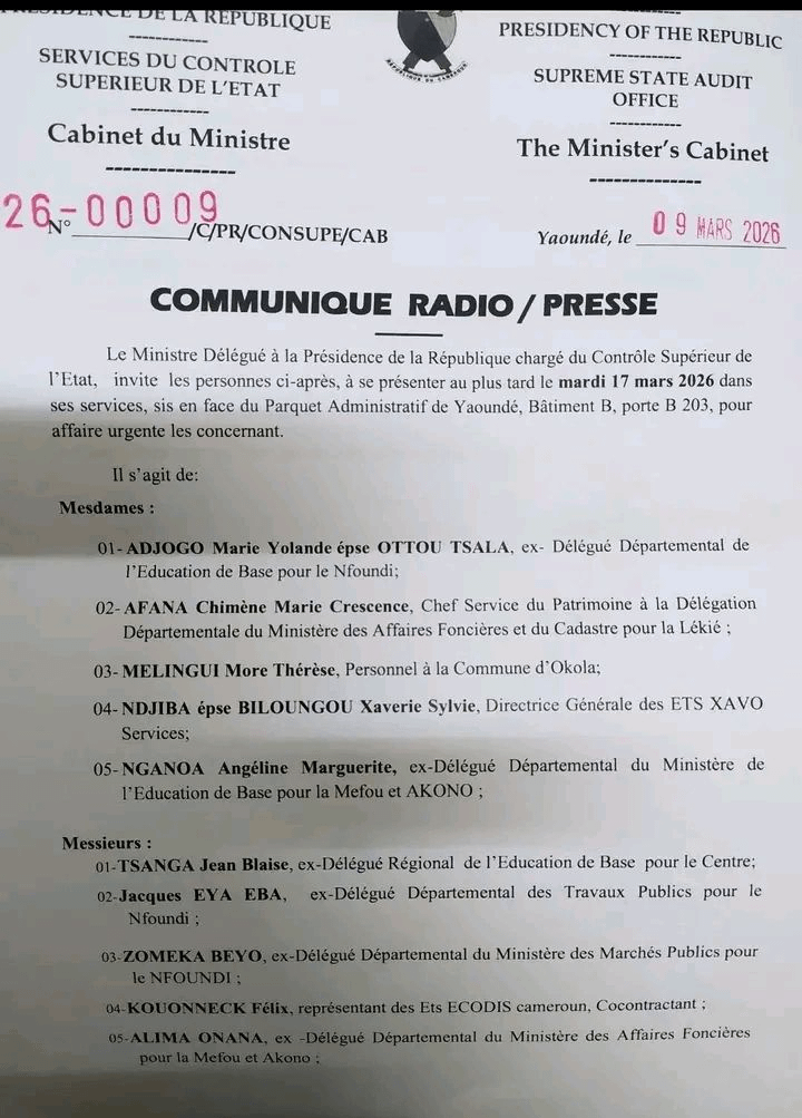 Urgent : Des gestionnaires de crédit et autres convoqués par le contrôle supérieur de l’État ( Communiqué)le courrier du cameroun