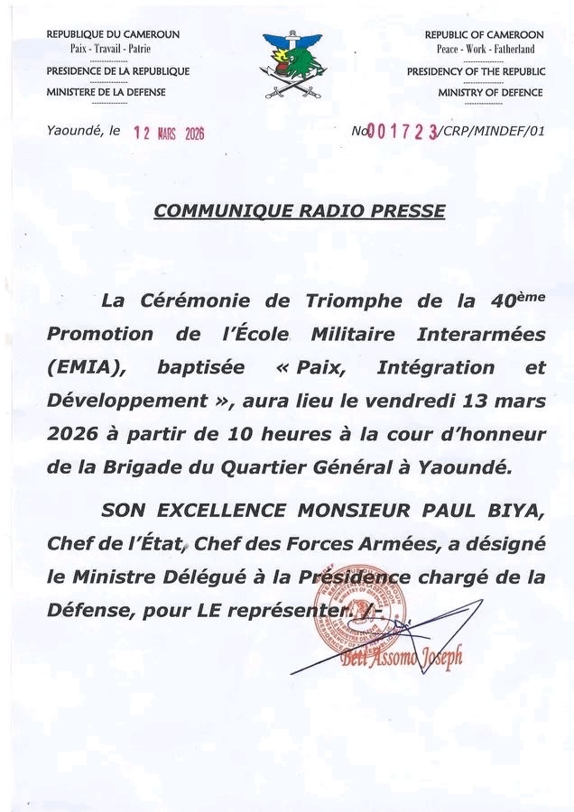 Le Ministre délégué à la présidence chargé de la défense Joseph Beti Assomo représentera le Président Paul Biya ce vendredi 13 Mars 2026 à la cour d’honneur de la brigade du quartier général, à la cérémonie de triomphe de la 40 ème promotion de l’école militaire interarmes ( EMIA), a appris Le courrier du cameroun.