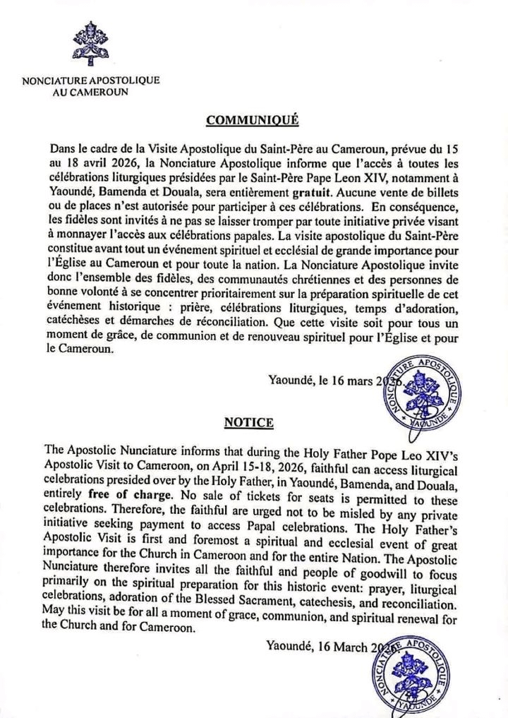 « Dans le cadre de la Visite Apostolique du Saint-Père au Cameroun, prévue du 15 au 18 avril 2026, la Nonciature Apostolique informe que l’accès à toutes les célébrations liturgiques présidées par le Saint-Père Pape Leon XIV, notamment à Yaoundé, Bamenda et Douala, sera entièrement gratuit. Aucune vente de billets ou de places n’est autorisée pour participer à ces célébrations. En conséquence, les fidèles sont invités à ne pas se laisser tromper par toute initiative privée visant à monnayer l’accès aux célébrations papales. La visite apostolique du Saint-Père constitue avant tout un événement spirituel et ecclésial de grande importance pour l’Église au Cameroun et pour toute la nation. La Nonciature Apostolique invite donc l’ensemble des fidèles, des communautés chrétiennes et des personnes de bonne volonté à se concentrer prioritairement sur la préparation spirituelle de cet événement historique: prière, célébrations liturgiques, temps d’adoration, catéchèses et démarches de réconciliation. Que cette visite soit pour tous un moment de grâce, de communion et de renouveau spirituel pour l’Eglise et pour le Cameroun« : précise ledit communiqué.