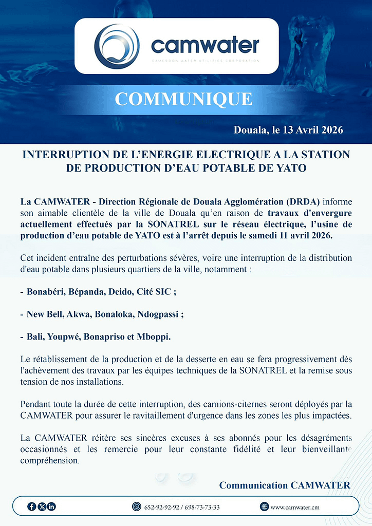 Société Douala : Plusieurs quartiers sans eau suite à l’interruption de l’énergie à la station de Yato (Communiqué) Par Le courrier du cameroun • 13 avril 2026 • 1 min de lecture Camwater présente ses sincères excuses aux populations de Douala et ses environs, du fait des désagréments subis.