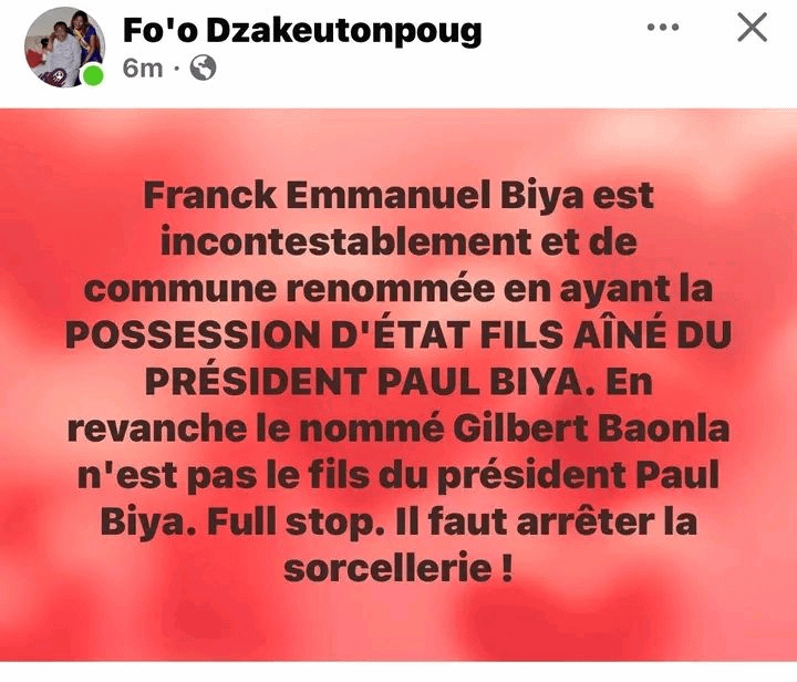 Pour une énième fois, Georges Gilbert Baongla a qualifié Franck Emmanuel Biya de fils adoptif de Paul Biya : » Nous sommes quatre , il y a trois enfants biologiques et un enfant adoptif » a t’il clamé sur le plateau de Libre Expression, à Info TV dimanche dernier. Réponse du berger à la bergère : « Franck Emmanuel Biya est incontestablement et de commune renommée en ayant la POSSESSION D’ÉTAT FILS AÎNÉ DU PRÉSIDENT PAUL BIYA. En revanche le nommé Gilbert Baongla n’est pas le fils du président Paul Biya. Full stop. Il faut arrêter la sorcellerie ! » lui a retorqué Jean de Dieu Momo, Ministre délégué auprès du Ministre de la justice, quelques heures plus tard.